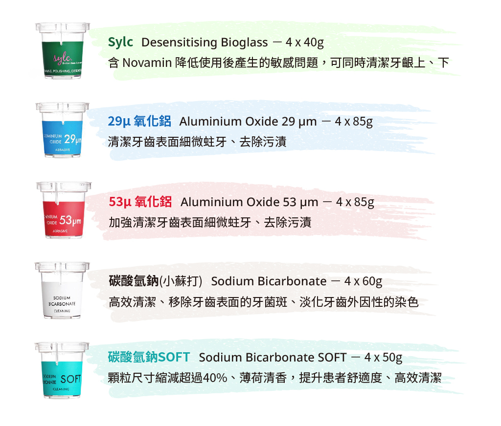 除了切削、噴砂效率極佳外,如想使用在牙齦下 ( 3 ~ 5mm ) 的清潔只要把壓力降到最低,就能搭配 SYLC 生物玻璃來清潔牙齦下的區域