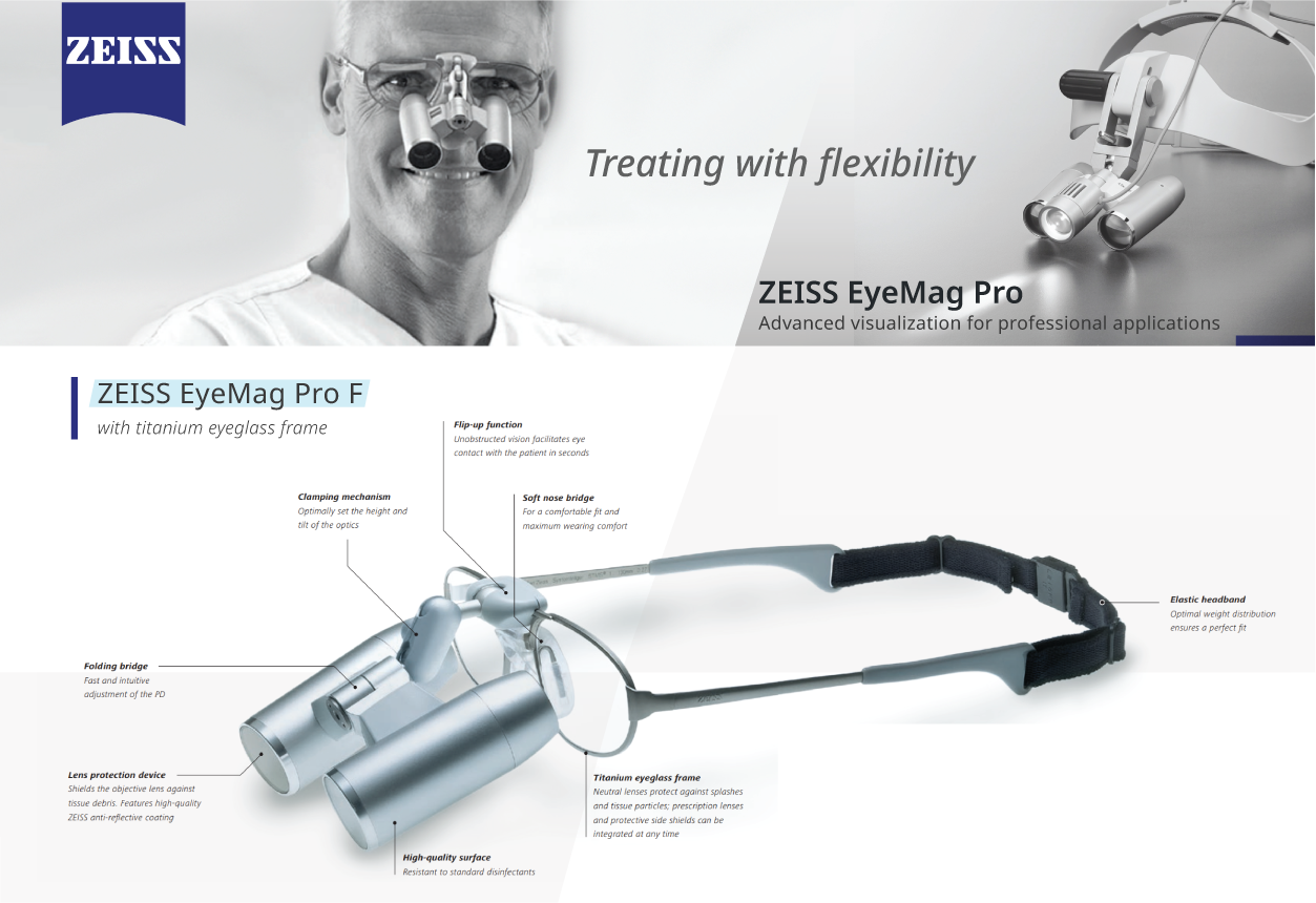 ◆ EyeMag Pro F 使用克卜勒光學系統,搭配輕巧的鈦金屬眼鏡架