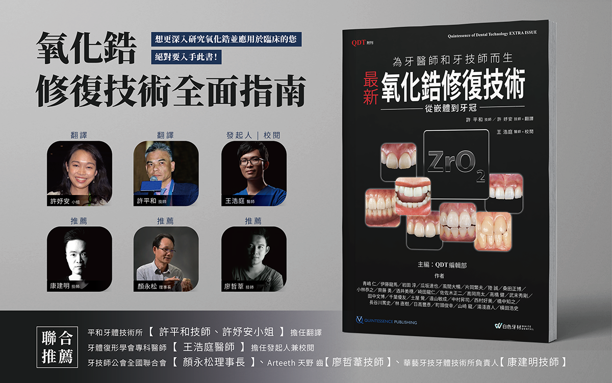 在這樣的趨勢下,本刊以「從嵌體到牙冠」為關鍵字,整合氧化鋯修復體的零散資訊,並邀請許多在該領域頗負盛名的當代牙醫師和牙體技術師,各從 Chair-side 和 Lab-side 的角度說明氧化鋯的臨床應用與操作細節,期待能滿足更多的患者需求。